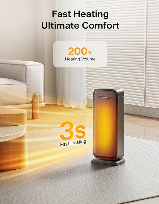 Lleva aire caliente a cada rincón de tu habitación. La oscilación gran angular de 80° se extiende para cubrir toda el área. Este calentador portátil está diseñado para sentarse junto a tus pies para calentar rápidamente habitaciones pequeñas a grandes, incluyendo oficinas, dormitorios y salas de estar en días fríos. Cobertura de calefacción: 200 pies cuadrados