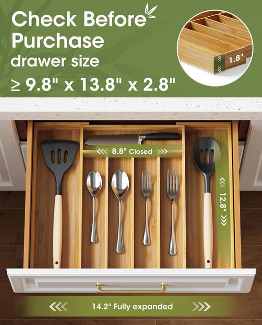 AUJEN Organizador de cubiertos de bambú, organizador de cajones expandible, organizador de utensilios ajustable