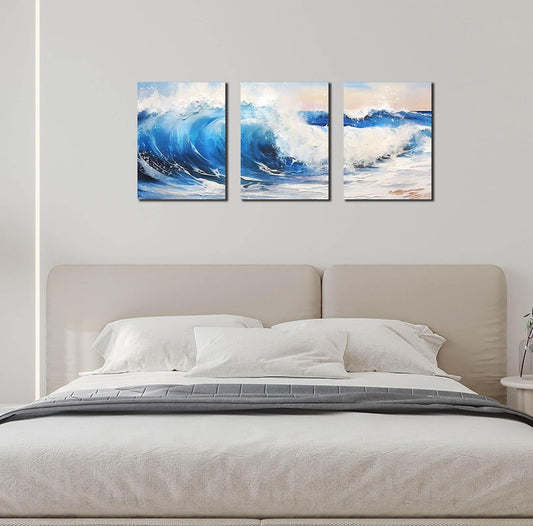CANEITO Arte de pared de océano para sala de estar, decoración de pared azul para dormitorio, impresión en lienzo de olas de mar, tamaño 12 x 16 pulgadas, 3 piezas