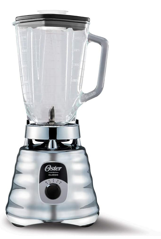Oster Licuadora cromada original de 3 velocidades, motor 6 veces más duradero, 10 veces más fuerte, tarro de vidrio