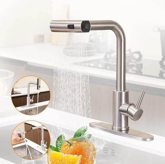 KEER Grifo de cocina en cascada con ducha extraíble, mango único y giratorio de acero inoxidable de 360°,