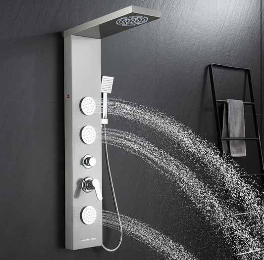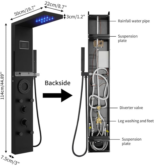 ROVOGO Sistema de torre de panel de ducha LED, cabezal de ducha iluminado de 2 ajustes (lluvia + niebla), 3 chorros corporales, boquilla de mano y bañera, columna de ducha de acero inoxidable de 46.5