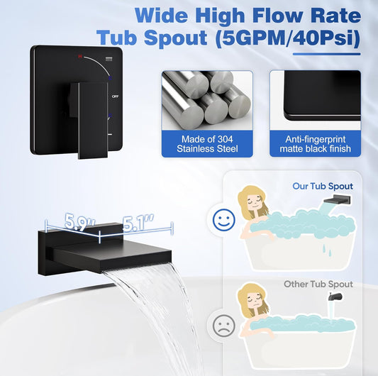 RUMOSE Sistema de torre de panel de ducha negro oscuro, juego de grifos de ducha de 5 funciones, cabezal de ducha de lluvia con luz LED, pantalla digital con chorros de masaje