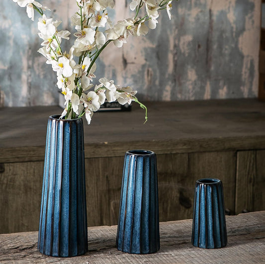 Jarrones de cerámica azul – 3 pequeños jarrones acanalados para flores, decoración minimalista moderna del hogar