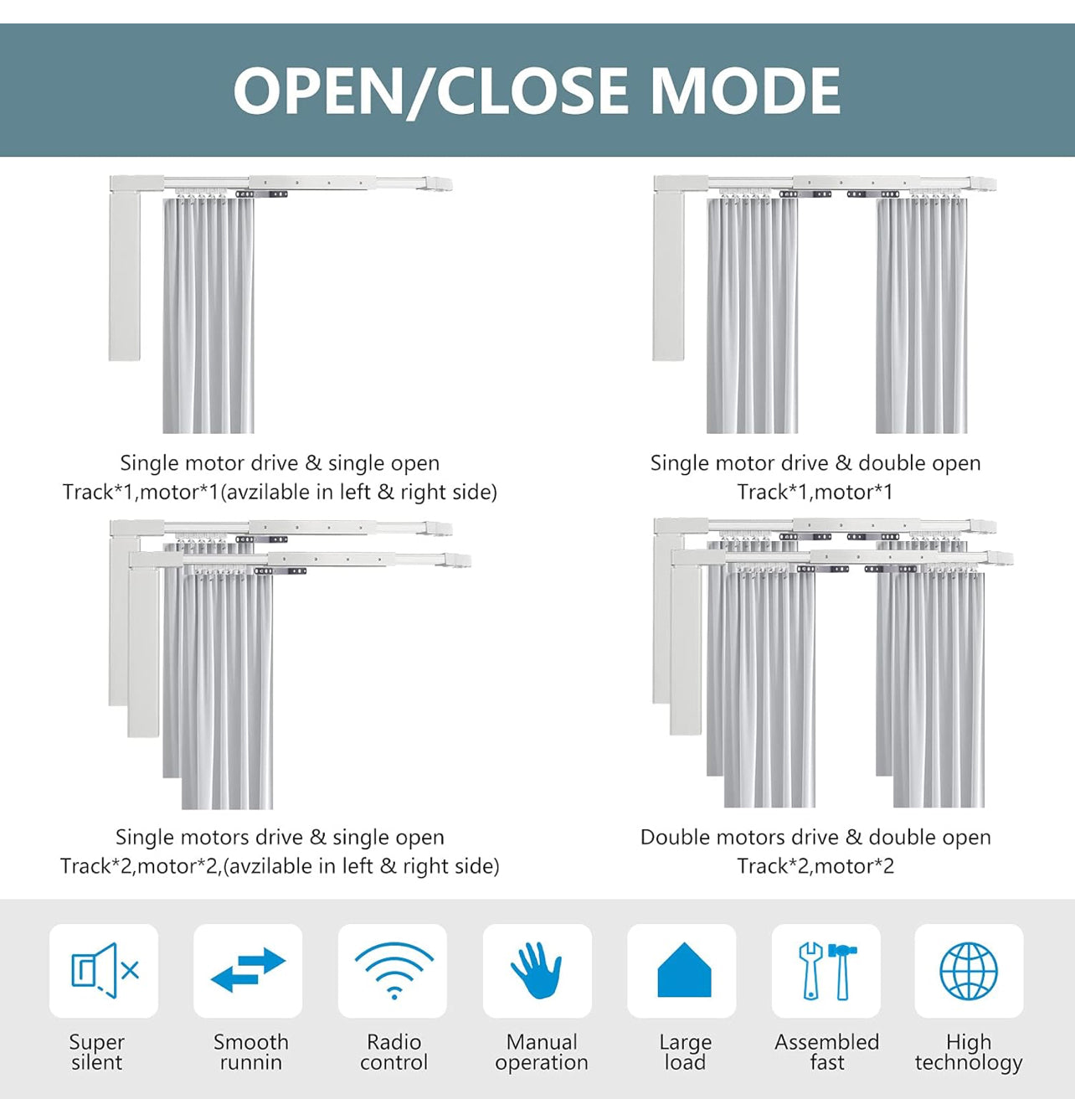 - Cortineros eléctricos de gran carga: pueden tirar de 88.2 a 132.3 libras de peso (dependiendo de la longitud del riel) y también están equipados con protección contra sobrecarga. Adecuados tanto para ventanas rectas como curvas. Nuestro riel para cortina motorizada se puede instalar en una solo riel (para abrir y cerrar por un lado) o con doble riel (para abrir y cerrar por los dos lados), consulta el video de instalación (idioma español no garantizado).