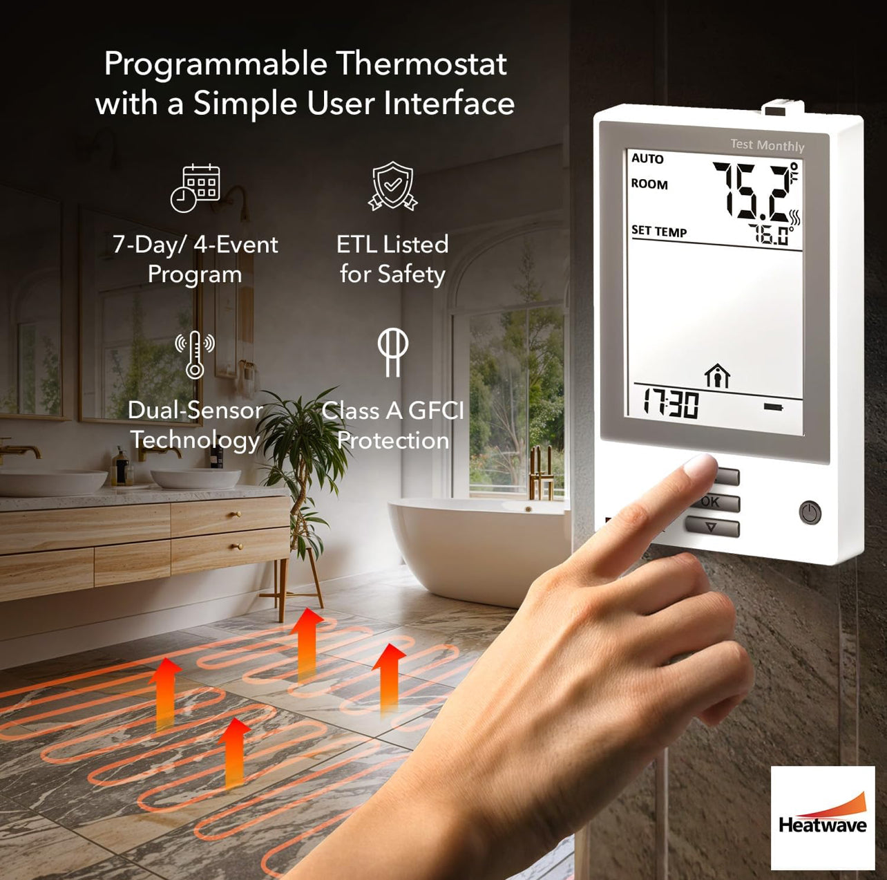 - Termostato programable: El termostato programable de 7 días/4 eventos incluido le permite programar sus preferencias de calefacción para su sistema de calefacción por suelo radiante eléctrico. Ofrece comodidad personalizable, asegurando que su sistema de suelo radiante esté listo cuando lo necesite. Soporta 120/240V y controla hasta 15 amperios, ideal para calefacción por suelo radiante eléctrico.