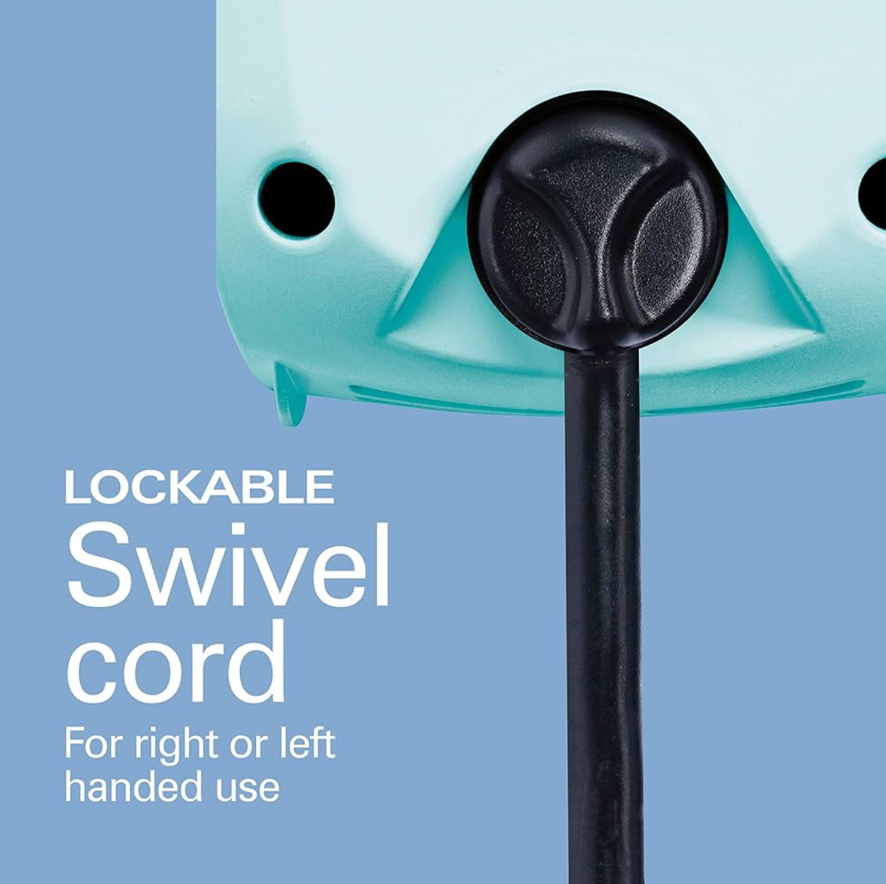 - Cable giratorio para uso diestro o zurdo. El cable se ajusta y se bloquea en su lugar para mantenerse fuera de tu camino.