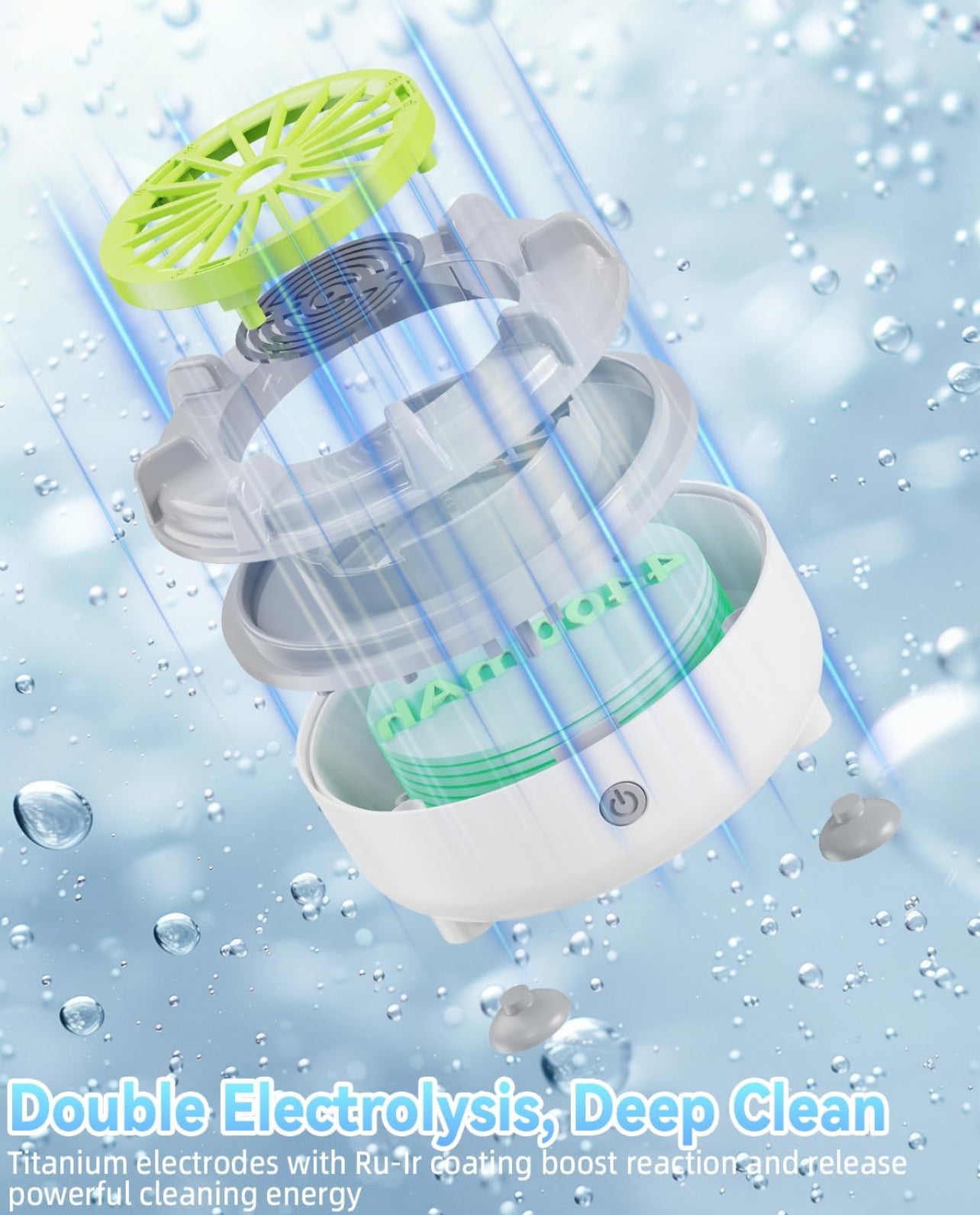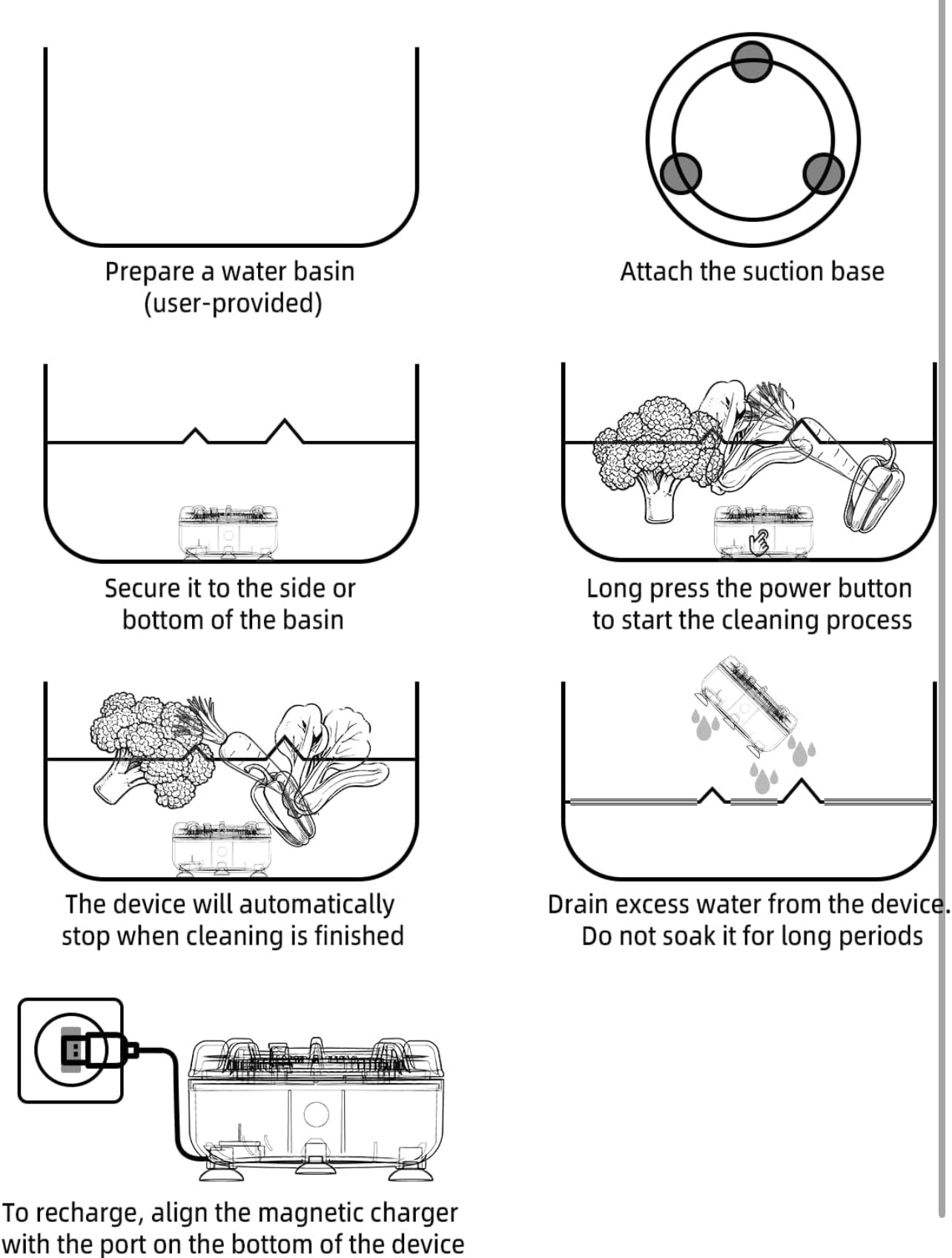 - Rápido y fácil de usar: simplemente llena un recipiente con 3 – 5 litros de agua, añade una pizca de sal, presiona el botón de encendido dos veces y sumerge el dispositivo. En solo 5 a 10 minutos, tus productos, carnes o vajillas se limpiarán a fondo, manos libres y de forma natural