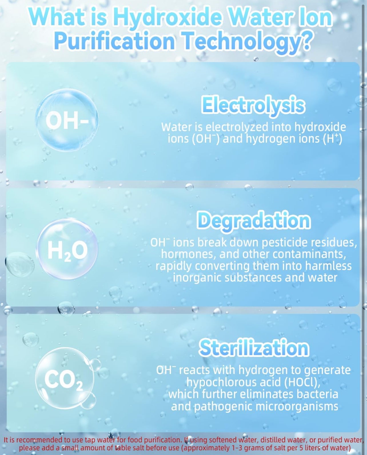 - Purificación avanzada de radicales hidroxilos: aprovecha el poder de los radicales hidroxilo de alta energía generados a través de la electrólisis del agua y la sal. Este avanzado método de purificación elimina eficazmente los residuos superficiales e impurezas, asegurando alimentos más limpios y frescos para ti y tu familia, todo sin aditivos químicos