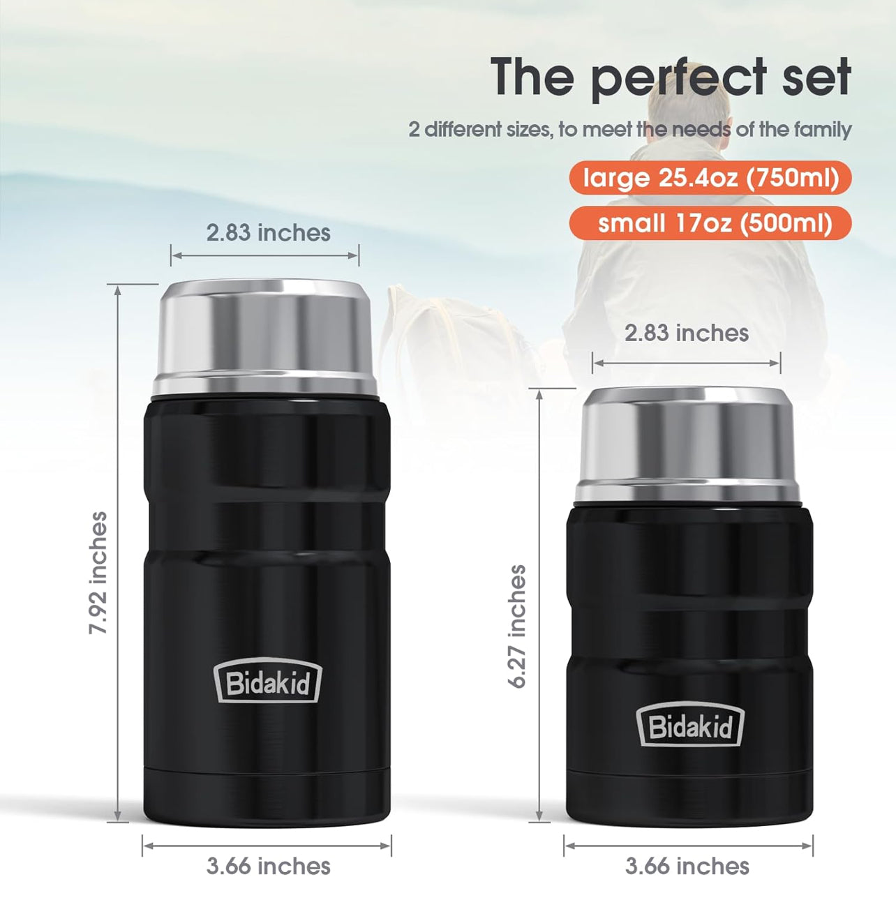El frasco aislado grande (25 onzas) en el juego es lo suficientemente grande como para contener una comida entera, y el pequeño (16.9 onzas) es lo suficientemente pequeño como para contener sopa o para tu hijo.