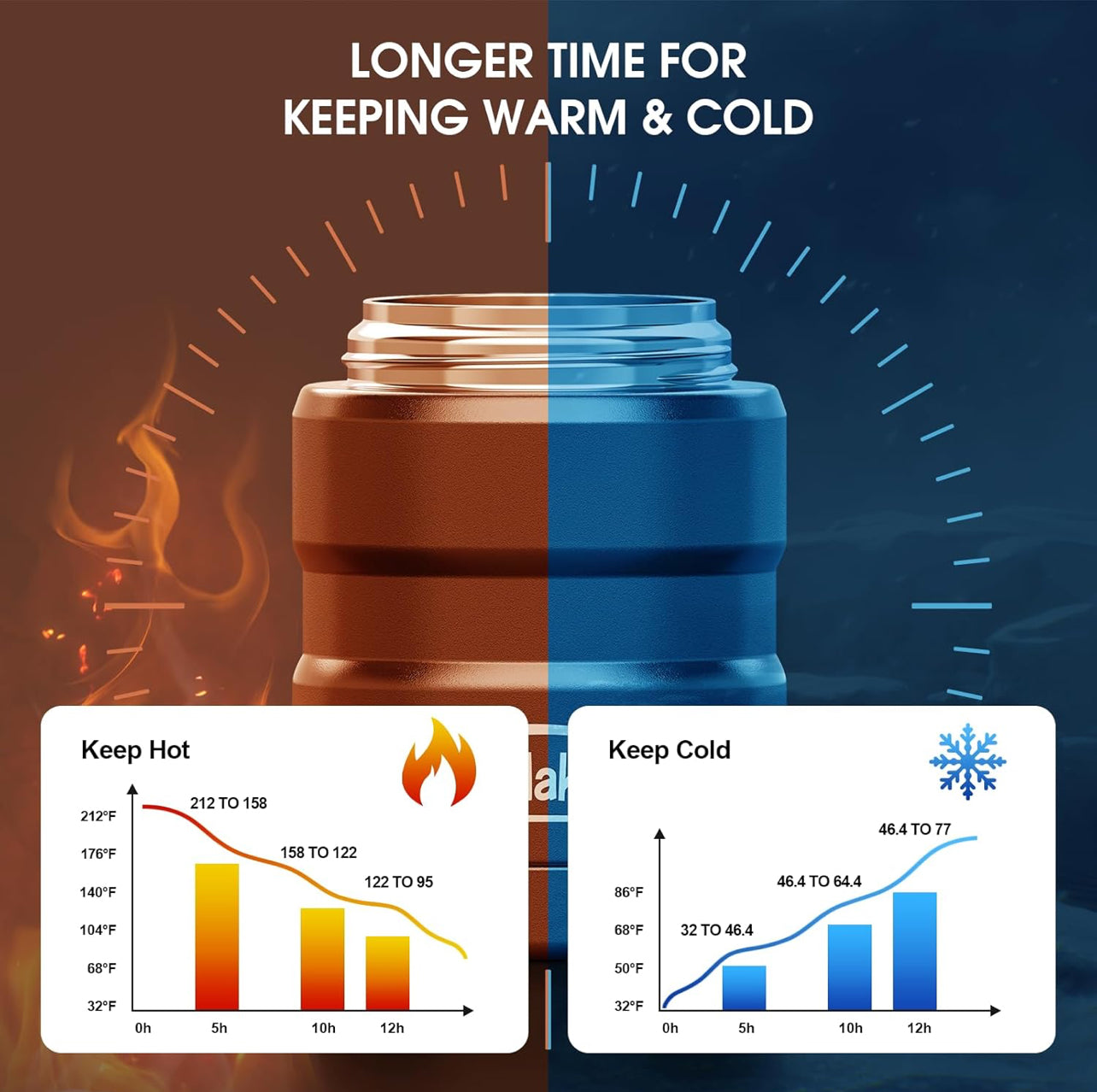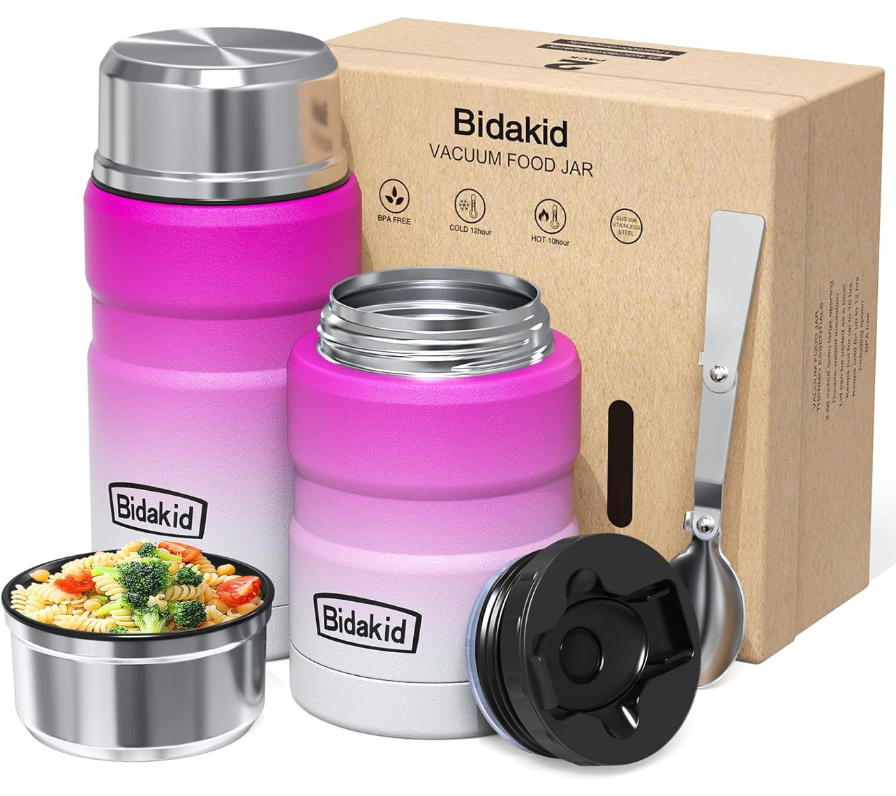 - Retención de temperatura inigualable: con aislamiento al vacío de doble pared y construcción sin costuras, los frascos de comida de Bidakid mantienen las comidas calientes o frías durante 12 horas impresionantes, perfectos para el trabajo, la escuela o los viajes.